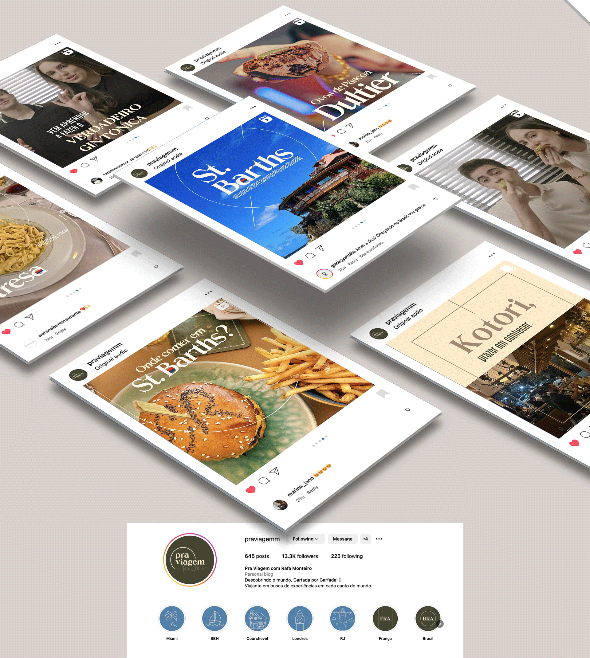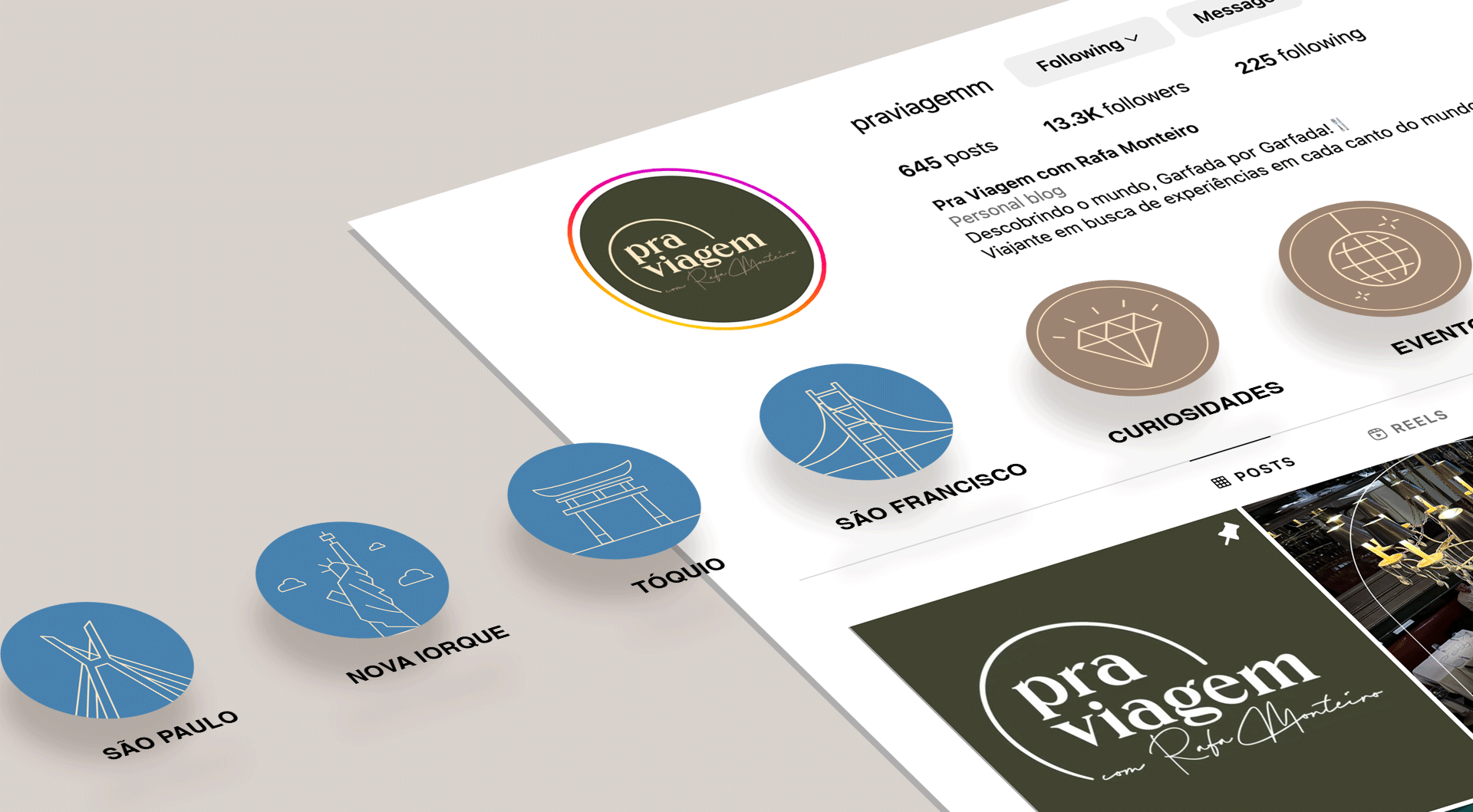We create all assets for Pra Viagem by Rafa Monteiro instagram page, focuses on capturing the essence of travel and adventure. The visual identity integrates vibrant colors and dynamic elements that reflect the excitement and diversity of exploring new places.